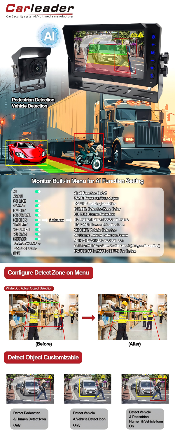 Pemantauan Pemandu AHD Kamera Pandangan Dalam KabinSistem Pemantauan Pengesanan Titik Buta AI BSD 7 Inci Carleader Penentukuran AI direka bentuk dengan algoritma ketepatan tinggi AI termaju dan operasi cz menu mesra pengguna. Sistem kamera AI ini menyediakan pemandu dengan semua cuaca, pejalan kaki berketepatan tinggi dan amaran dinamik kenderaan, dengan berkesan mengurangkan risiko kemalangan jalan raya. Sistem kamera pemantauan AI sesuai untuk kereta persendirian, armada komersial dan kenderaan khas. Sistem AI armada mempunyai integrasi dan keserasian yang kukuh, ketahanan dan keupayaan pemantauan masa nyata.