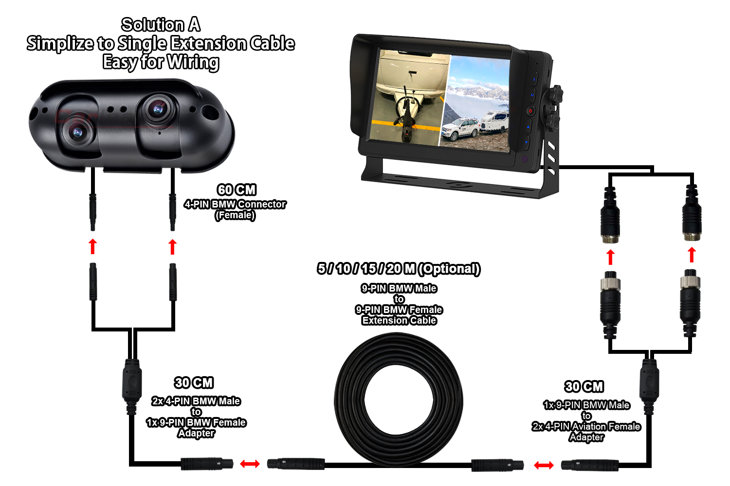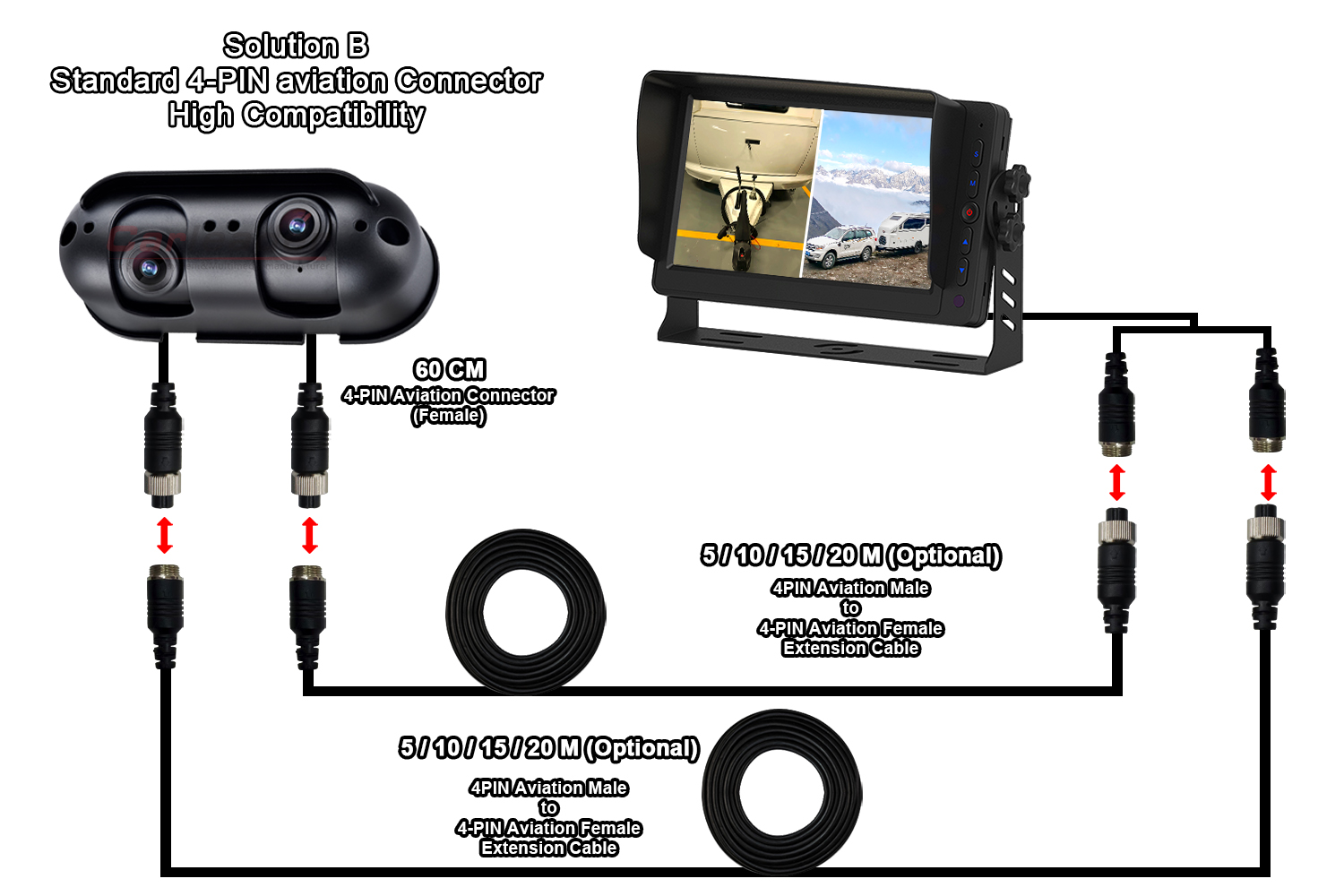Kamera Pandangan Belakang AI Bunyi dan Penggera Cahaya Pengesanan Buta Terbina dalamCarleader AHD Starlight Dual Lens Kamera Pandangan Belakang muat Untuk RV Motorhome, kamera AHD perkakasan persendirian baharu yang berkualiti tinggi, disepadukan dengan dwi kanta dalam satu kamera, dan sudut kanta boleh laras secara berasingan, yang membolehkan pengguna melihat kedua-dua penglihatan jarak dekat dan jauh pada monitor yang sama. Kamera ini bukan sahaja sesuai untuk kenderaan tugas berat, seperti trak, bas, forklift, dll; juga sesuai untuk kenderaan bermotor, seperti RV dan karavan.