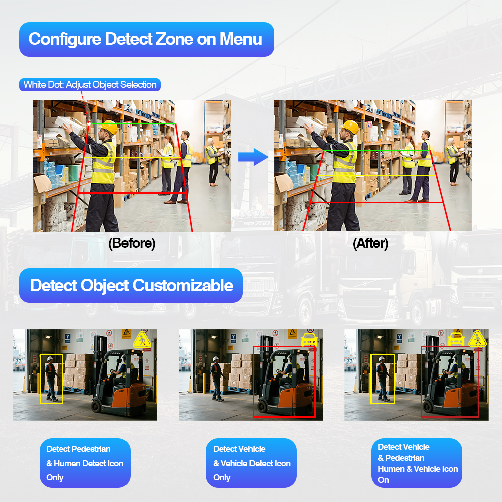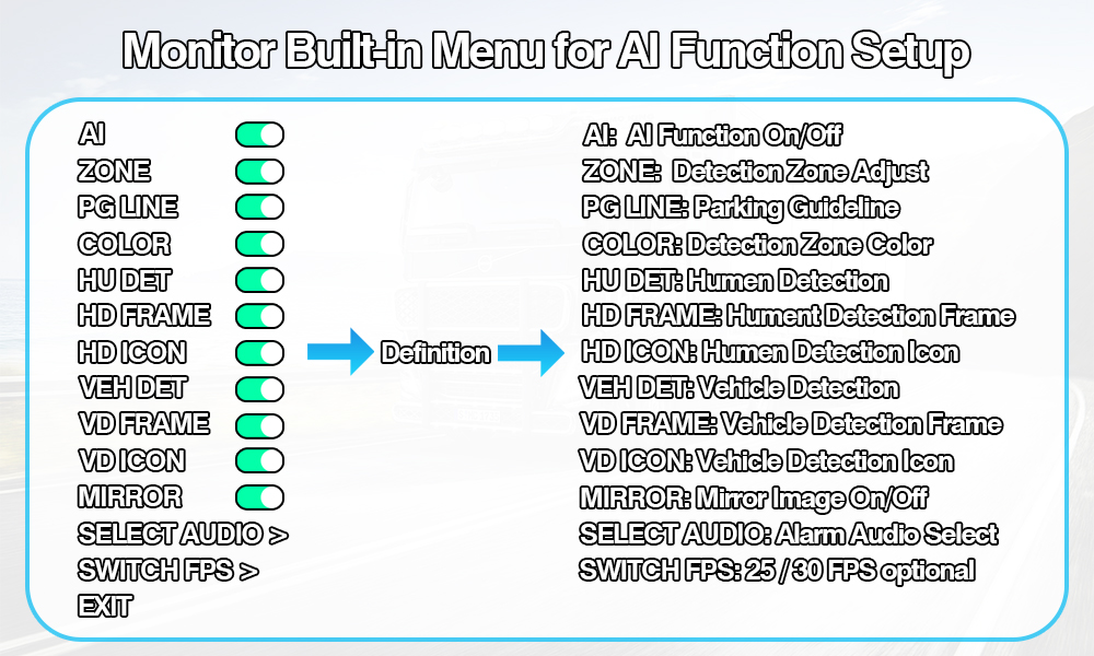 Lampu Amaran Penukaran Warna Pengesanan Buta AI Kamera Pandangan Belakang Terbina dalamSistem Kamera Pengesanan Titik Buta AI Lampu Amaran Menukar Warna Terbina Dalam ialah set keselamatan kenderaan pintar yang termasuk kamera AI BSD dan monitor AI yang menyokong tetapan penentukuran AI, membolehkan pengguna menukar tetapan AI, seperti pelarasan saiz kawasan pengesanan, jenis penggera audio boleh dipilih, hidup/mati pengesanan pejalan kaki, tetapan hidup/mati pengesanan kenderaan dan sebarang tetapan penentukuran lain.