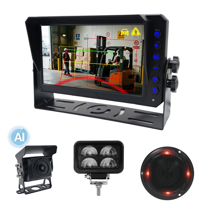 Kamera Pandangan Belakang AI Bunyi dan Penggera Cahaya Pengesanan Buta Terbina dalamCarleader Sistem Kamera Amaran Cahaya Laser Pengesanan Pejalan Kaki dan Kenderaan AI untuk Forklift, sistem kamera AI BSD berfungsi untuk forklift, dilengkapi dengan lampu amaran laser bentuk-U dan penggera bunyi & cahaya, yang membolehkan anda memperoleh prestasi yang lebih baik untuk memberi amaran kepada pejalan kaki dan kenderaan di sekeliling untuk meninggalkan jarak operasi forklift. Sistem ini menyokong fungsi pengesanan titik buta AI, boleh mengesan pejalan kaki dan kenderaan. Menu penentukuran AI terbina dalam untuk melaraskan zon pengesanan, pengesanan pejalan kaki hidup/mati, pengesanan hidup/mati kenderaan, dll. Penyelesaian lanjutan untuk meningkatkan keselamatan operasi forklift.