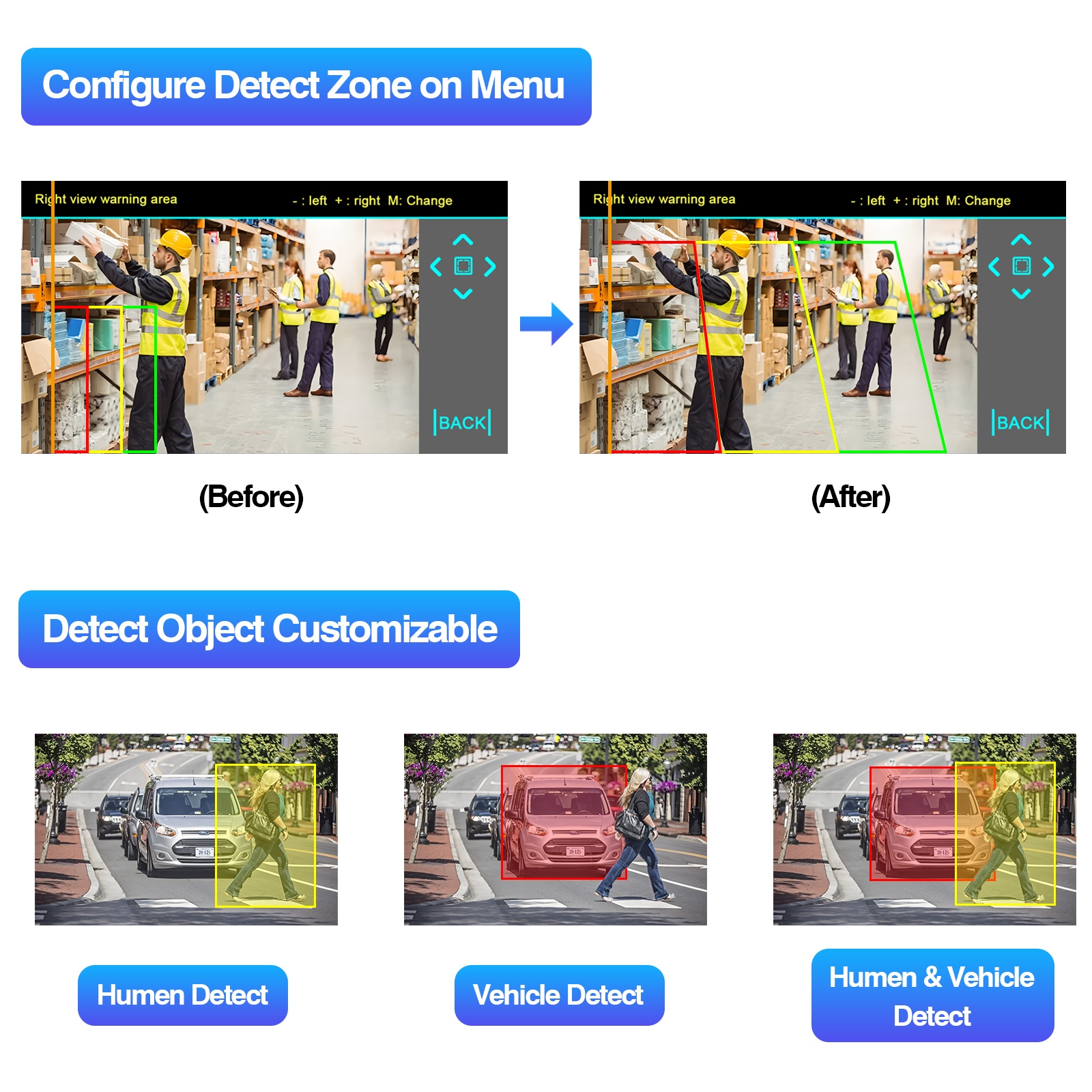 Pengesanan pintar: Amaran masa nyata untuk objek yang memasuki zon buta, menyokong penentukuran fungsi AI, boleh laras melalui garis penentukuran trapezoid (hijau untuk kawasan amaran, biru untuk penjajaran kenderaan).