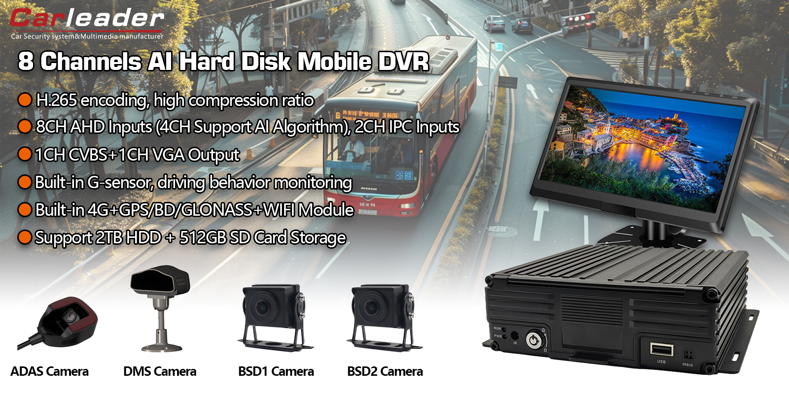 Memperkenalkan CarleaderSokongan DVR Mudah Alih HDD AI 8CH ADAS+DMS+BSD, Perakam Video Digital Pemacu Keras Tinggi 8 saluran yang direka bentuk untuk pengawasan kenderaan profesional dan pengurusan armada pintar. Menggabungkan reka bentuk perkakasan yang teguh dengan algoritma AI lanjutan termasuk ADAS, DSM, BSD. Ia menyampaikan rakaman video berkualiti tinggi yang boleh dipercayai, bantuan pemandu yang komprehensif dan pemantauan keselamatan proaktif—semuanya dalam satu sistem bersepadu.