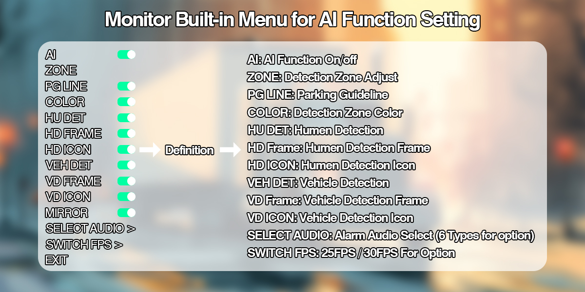 CarleaderSistem Pemantauan Pengesanan Titik Buta AI BSD 7 Inci Menyokong Penentukuran AI, penyelesaian kamera AI yang menyokong pengesanan pejalan kaki, pengesanan kenderaan, meningkatkan keselamatan dengan ketara semasa memandu, memantau dengan menu penentukuran AI terbina dalam, membolehkan pengguna melaraskan kawasan pengesanan, hidup/mati paparan warna zon pengesanan, jenis audio penggera, paparan ikon kenderaan dan pejalan kaki, pemilihan objek pengesanan, dsb.