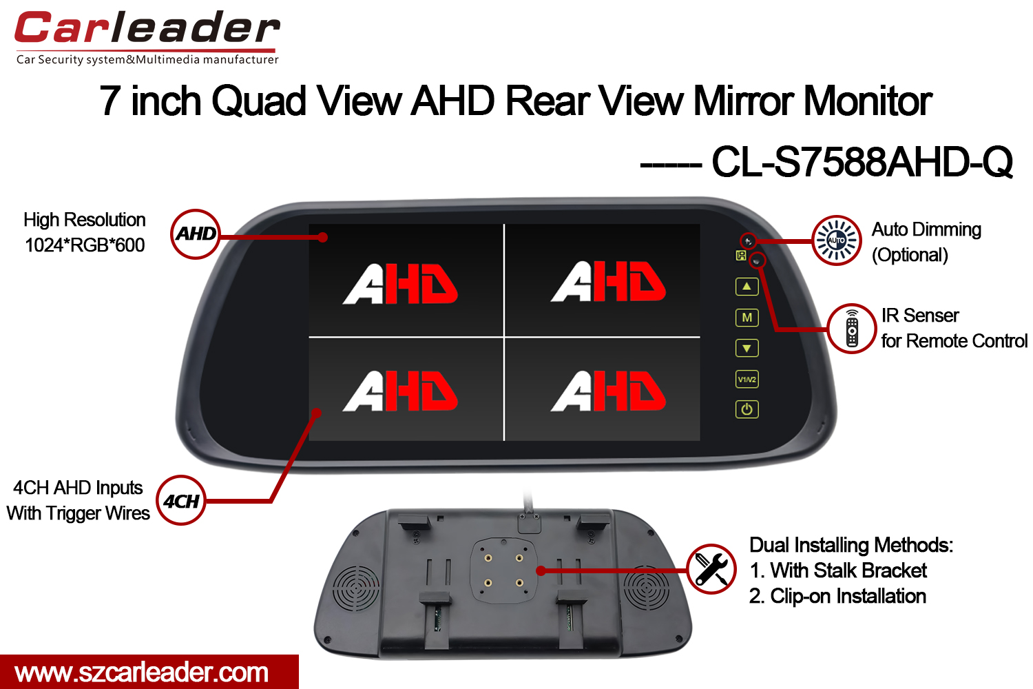 Alami kejelasan dan serba boleh denganCarleaderMonitor Cermin Pandangan Belakang 7 Inci 4CH AHD Menyokong Pemasangan Dwi, monitor AHD paparan quad 7-inci canggih yang direka untuk sistem kenderaan berbilang kamera. Dengan reka bentuk pemasangan 2 dalam 1 untuk penyelesaian pemasangan yang boleh dipilih. Dilengkapi dengan teknologi AHD termaju, monitor ini memberikan visual masa nyata yang tajam merentasi empat saluran kamera paparan empat, memastikan keselamatan dan kesedaran situasi yang maksimum.