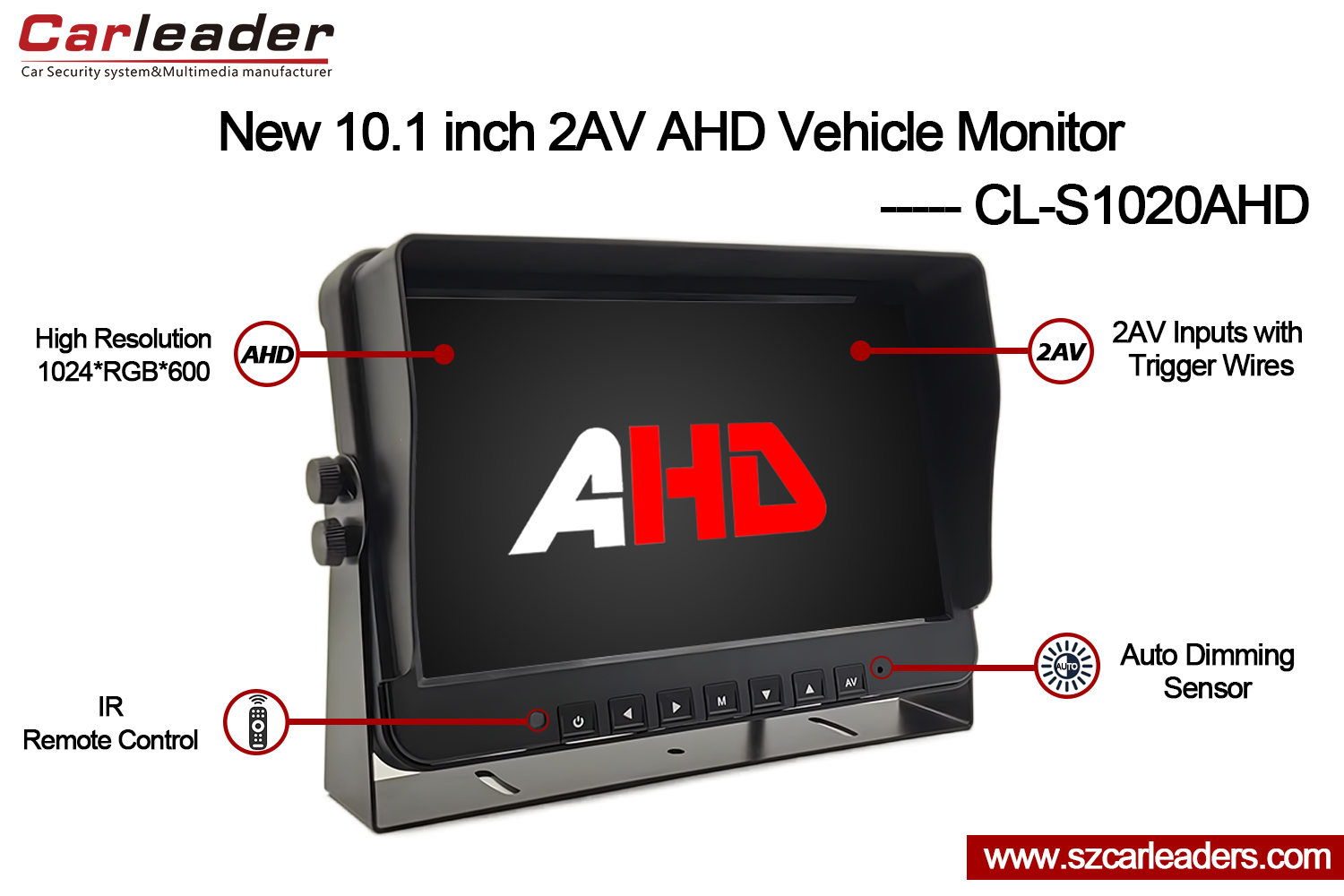 CarleaderMonitor Sandaran Kenderaan Input 2CH AHD 10.1 Incisesuai untuk trak, bas, van, RV, bas sekolah, jentera pertanian, jentera pembinaan, peralatan sanitasi, dll.