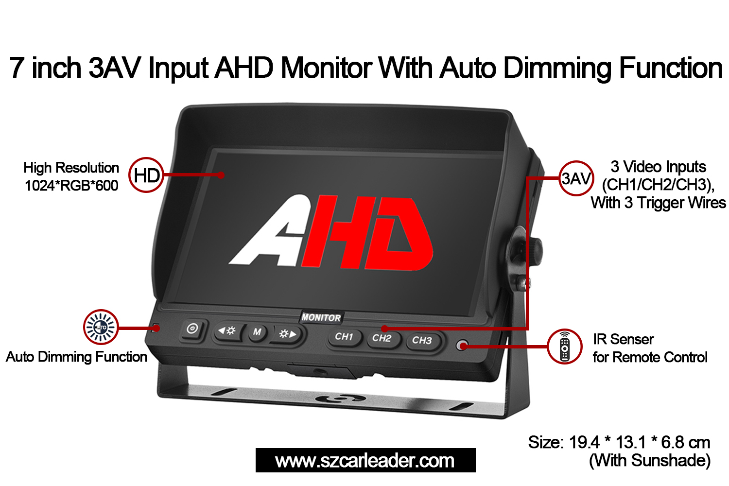 CarleaderMonitor Sandaran Kenderaan Input 3CH AHD 7 inciialah monitor AHD 7-inci teguh yang direka untuk penyepaduan yang lancar ke dalam sistem pengawasan dan automotif. Menampilkan panel Innolux digital dengan nisbah bidang 16:9, ia memberikan visual yang jelas pada resolusi 1024xRGBx600, memastikan kejelasan untuk aplikasi kritikal. Juga dilengkapi dengan input video AHD 3 saluran untuk memenuhi kebanyakan keperluan penglihatan kenderaan.