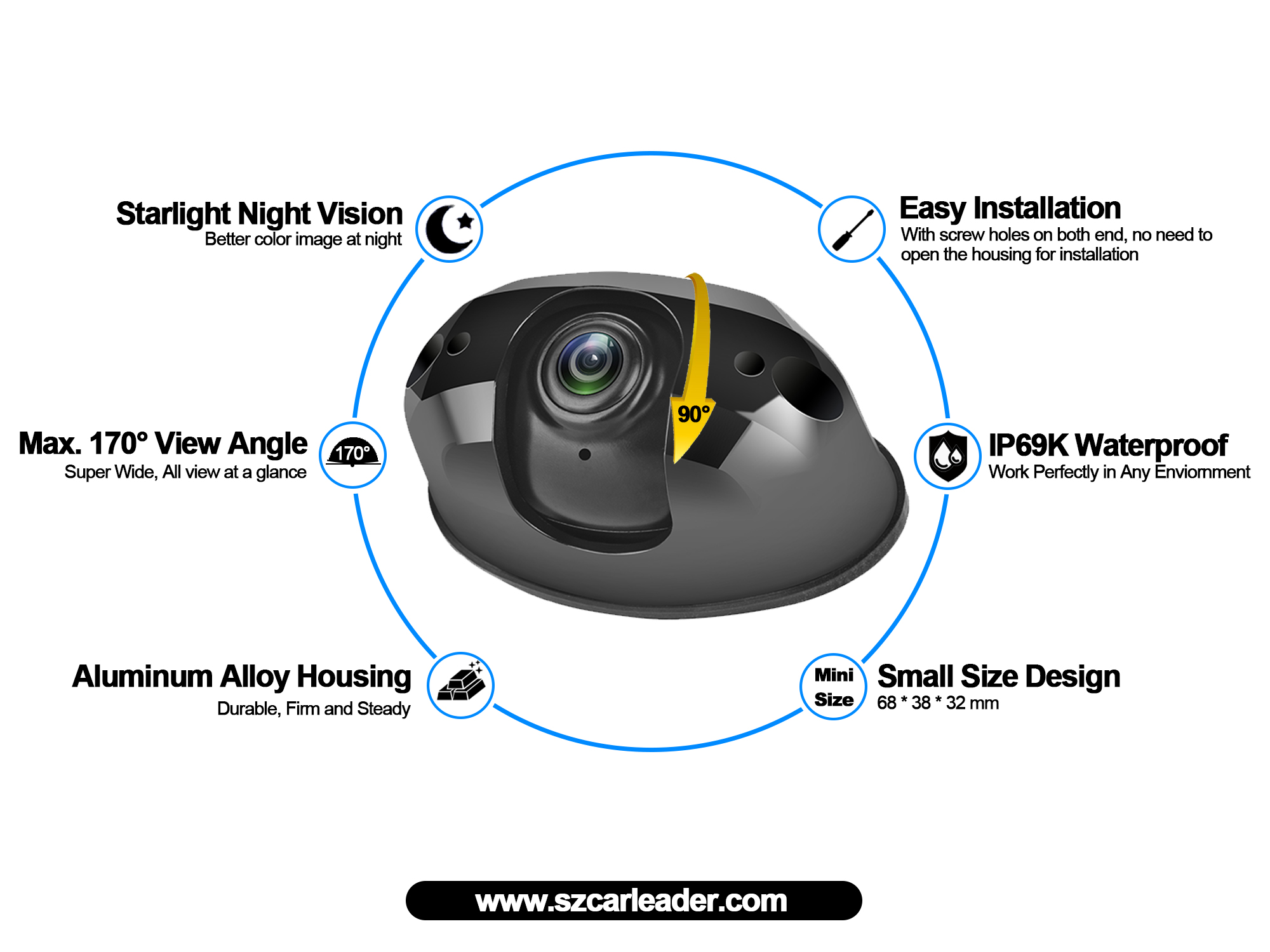 Kamera Sandaran Tugas Berat Kalis Air AHD 170 Darjah Sudut Pandangan Lebar memberikan pemandu gambar masa nyata yang jelas semasa proses pemanduan. Sudutnya yang sangat besar sehingga 170°, lebih banyak untuk pemandu menyediakan julat pemantauan yang luas, supaya pemandu boleh memantau persekitaran di sekeliling kenderaan tanpa sebarang titik buta