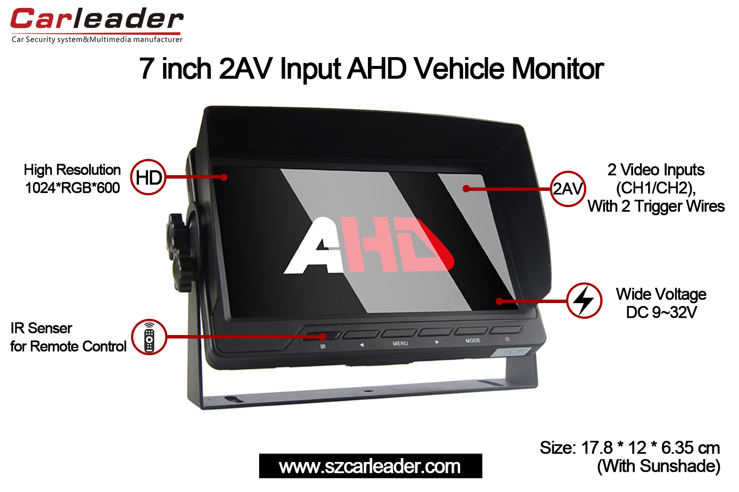 CarleaderMonitor Kenderaan Input AHD 2CH 7 inciialah Monitor AHD Kereta yang direka untuk menyampaikan paparan video yang jelas dan boleh dipercayai untuk aplikasi kenderaan komersial dan persendirian. Dibina dengan panel digital berkualiti tinggi dan menyokong input video AHD lanjutan, monitor ini memastikan penglihatan yang sangat baik dan kemudahan penggunaan dalam pelbagai keadaan pemanduan.