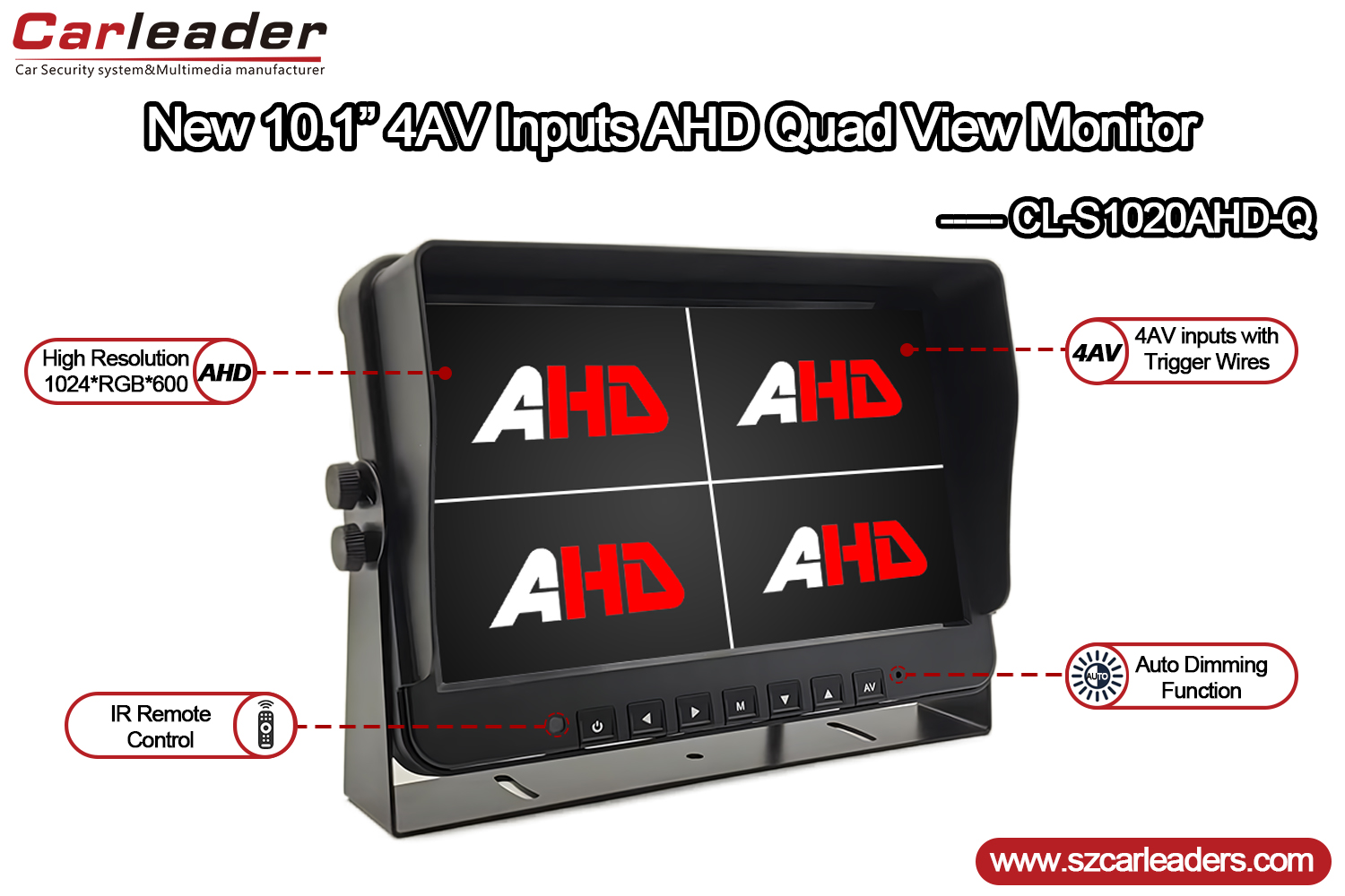 Sesuai untuk aplikasi pemantauan kenderaan, keselamatan dan industri,Carleader10.1 Inch 4CH Quad Display Monitor AHD Kenderaan Tugas Beratmenggabungkan fungsi yang mantap, kualiti paparan yang jelas dan pilihan yang boleh dikonfigurasikan pengguna dalam pakej yang padat dan tahan lama.