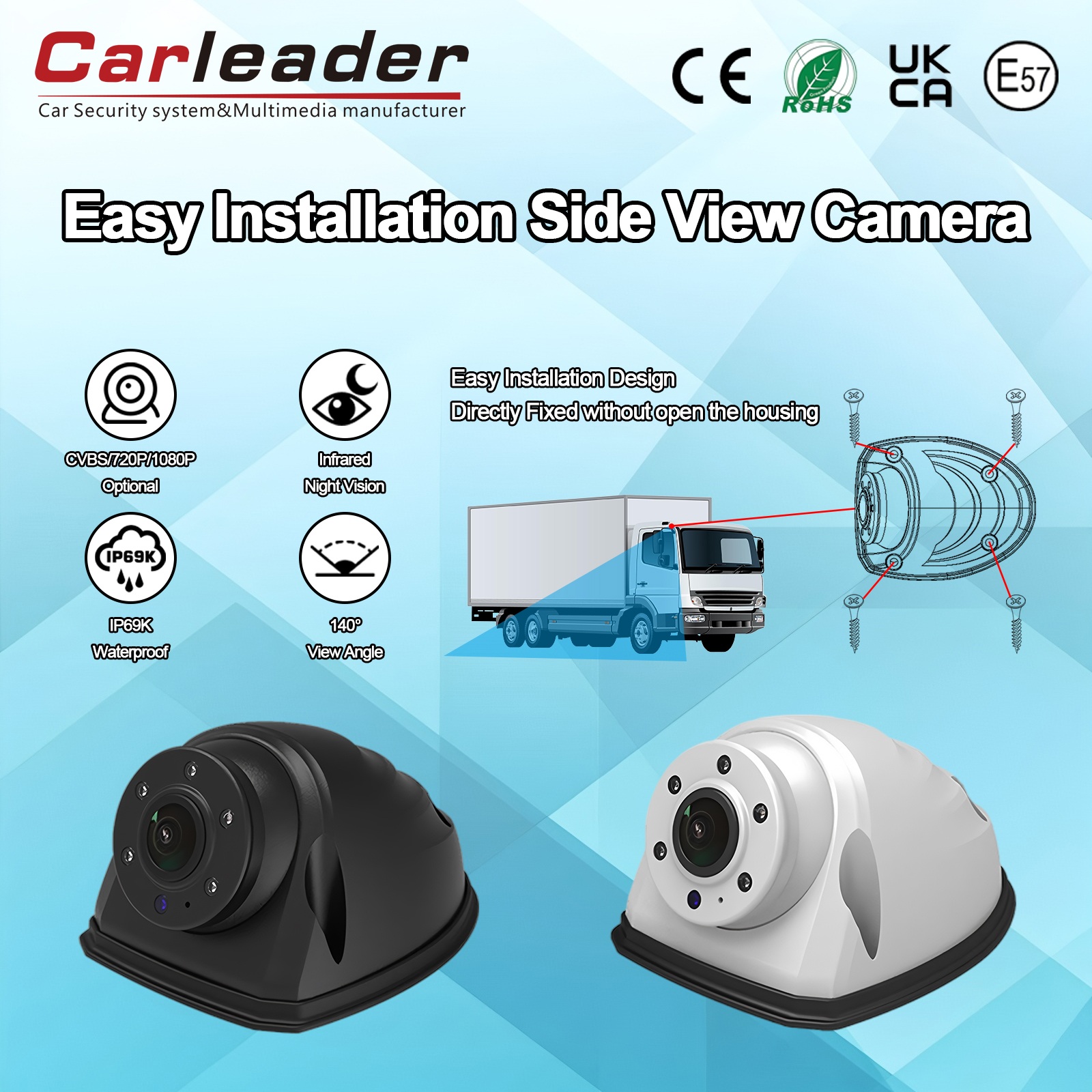 CarleaderKamera Pandangan Sisi Tugas Berat AHD Pemasangan Pantas Putihialah kamera AHD paparan sisi berprestasi tinggi yang direka untuk memberikan penglihatan yang jelas dalam sebarang keadaan cuaca yang teruk. Terutamanya Direka untuk prestasi pelbagai fungsi dan tahan lama, sistem kamera kompak ini sesuai untuk kenderaan komersial, peralatan industri dan aplikasi keselamatan di mana penglihatan persisian yang jelas diperlukan.